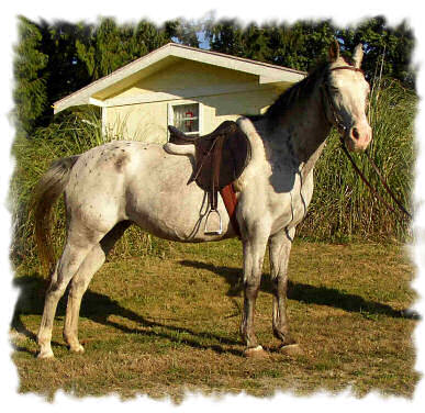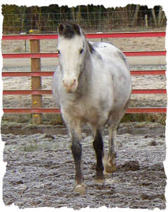 In working with this little 13:1-1/2 HH mare, we have found her to be amazingly gentle and kind, and very smart and willing. She is well trained, very quick and athletic, and in remarkable shape for her estimated age of 16 years. She is still a little leery of strangers, but is getting better by the day. Her varnish roan appy coat gleams, and her feet have grown out wonderfully after a bit of trimming to even them up.