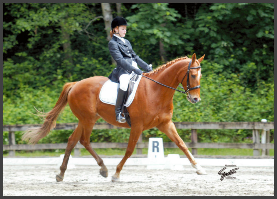 Sweet is a horse we purchased as a colt, and he's surprised a more than a few people with his talent and beauty. (we always knew he had it in him) He and his loving owner earned Reserve Champion at 2nd Level at the Cascade Championships at Donida Farm in September of 2005 . Elysia's consistent hard work and her own talents for training and riding him are really brought this good young horse along nicely! |