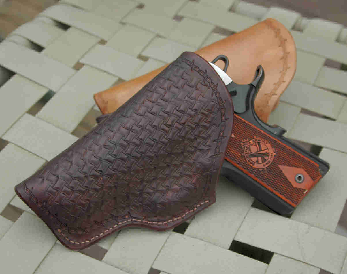 *****************************************************Pricing for hand-shaped plain pancake holsters start at $125, more for stamping, linings or special requests.