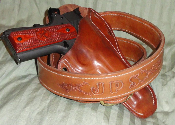 Custom ordered belt and matching holster for full-size 1911 type, modified pancake style |